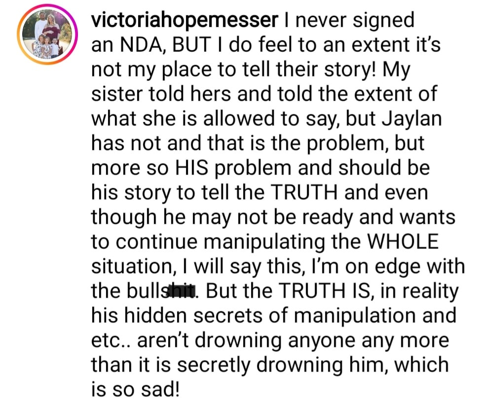 In the comments section of the post, Victoria elaborated and told Teen Mom fans that Jaylan is guilty of “manipulating” his ex, Leah.